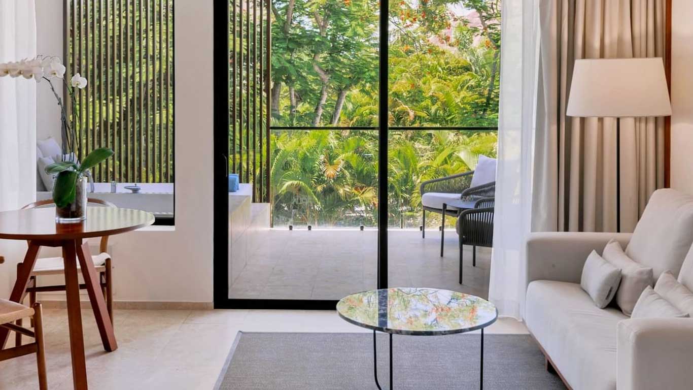 Live Aqua Punta Cana invites you to share in the luxury and beauty of the Junior Suite, thoughtfully designed to deliver an unmatched sense of comfort within a serene natural setting. Take in the stunning views from your private terrace and admire every corner of the resort as you unwind. Inside, enjoy a plush king-size bed dressed in premium linens, a 55-inch flat-screen TV, a fully stocked minibar, and a capsule coffee maker for added convenience. Refresh in the elegant, well-appointed bathroom featuring renowned Molton Brown amenities, the perfect finishing touch to your elevated escape.